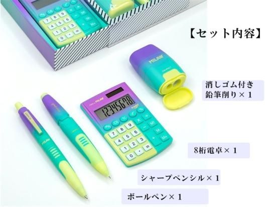 ●セット内容は「8桁電卓」「消しゴム付き鉛筆削り」「0.7mmシャープペンシル」「ブルーインクのボールペン」。