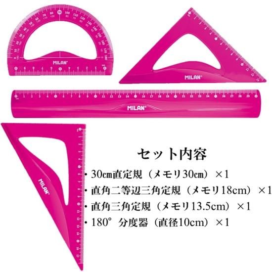■セット内容:30cm直定規(メモリ30cm)×1・直角二等辺三角定規(メモリ18cm)×1・直角三角定規(メモリ13.5cm)×1・180°分度器(直径10cm)×1
