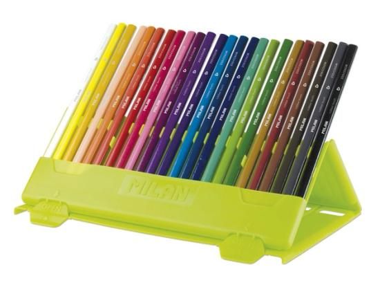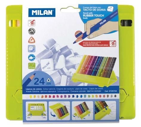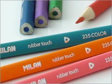 スペイン ミランの「プラスチックケース入 ラバータッチ★三角色鉛筆★24色」。色鉛筆のかたちは三角。ラバータッチで滑りにくく、握り心地◎。