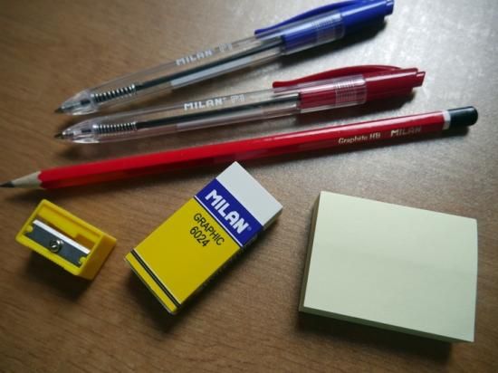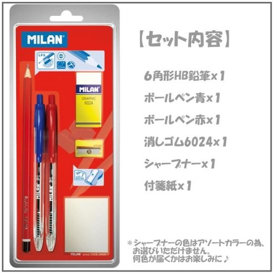 スペイン ミランの「文房具セット★80064」。文具定番アイテムの鉛筆・消しゴム・シャープナー・ボールペン・付箋紙がワンセットになっています。