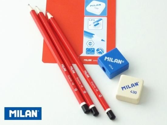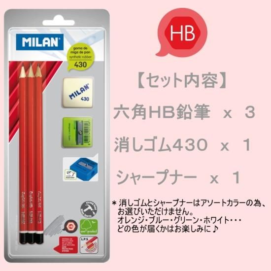 スペイン ミランの「文房具セット★10016」。文具の定番アイテムの鉛筆・消しゴム・シャープナーがワンセットになっています。鉛筆のかたちは六角でHB。クラッシカルなレッド&ブラックの組み合わせがレトロかわいい♪消しゴム430はミラン定番中の定番。愛用者が多いのもうなずけるロングセラー商品です。シャープナーも消しゴムに合わせたサイズ。消しゴム同様ボディにしっかりと「MILAN」ロゴ入りです♪以上の文房具定番3アイテムがブリスターパッケージで一まとめになっています。かわいくパッケージングされているので、このままプレゼントしてもステキですよね〜♪
